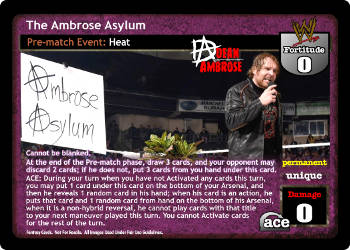You cannot pack this card if you are packing Face cards. After all players' Pre-match phases, before the first turn of the game, all players with fewer cards in their hand than their printed Starting Hand Size draw cards until they have cards in their hand equal to their printed Starting Hand Size. If any player first reveals a Heel card in his hand, he instead draws to his printed Starting Hand Size +2.