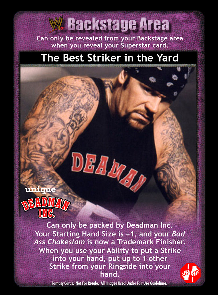 Can only be packed by Deadman Inc. Your Starting Hand Size is +1, and your Bad Ass Chokeslam is now a Trademark Finisher. When you put a Strike from your Ringside into your hand for your Ability, put another Strike from your Ringside into your hand.