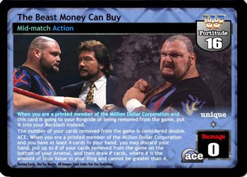 When you are a printed member of the Million Dollar Corporation and this card is going to your Ringside or being removed from the game, put it into your Backlash instead. The number of your cards removed from the game is considered double. ACE: When you are a printed member of the Million Dollar Corporation and you have at least 4 cards in your hand, you may discard your hand, put up to # of your cards removed from the game on the bottom of your Arsenal, and then draw # cards, where # is the amount of Stun Value in your Ring and cannot be greater than 4.