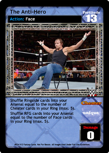 Cannot be packed by The Heat Seekers. When you are an Extremist, this card does not take up a Pre-match slot in your Ring and your opponent's Starting Hand Size is -1. At the end of the Pre-match phase, search your Arsenal for 1 Heel Action, reveal it, put it in your hand, and shuffle. The first Heel Action played on each of your turns is Multi when you do not have a card with that title in your Ring, and ignore 'completely' on his reversal cards played to it. His Once is Enough cards are +10F for each copy in his Ring.