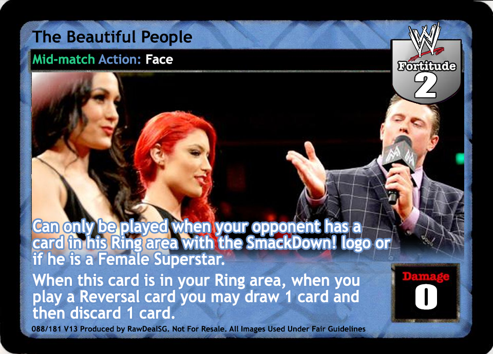 Can only be played when your opponent has a card in his Ring area with the SmackDown! logo or if he is a Female Superstar. When this card is in your Ring area, when you play a Reversal card you may draw 1 card and then discard 1 card.