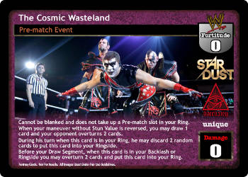 Cannot be blanked and does not take up a Pre-match slot in your Ring. When your maneuver without Stun Value is reversed, you may draw 1 card and your opponent overturns 2 cards. During his turn when this card is in your Ring, he may discard 2 random cards to put this card into your Ringside. Before your Draw Segment, when this card is in your Backlash or Ringside you may overturn 2 cards and put this card into your Ring.