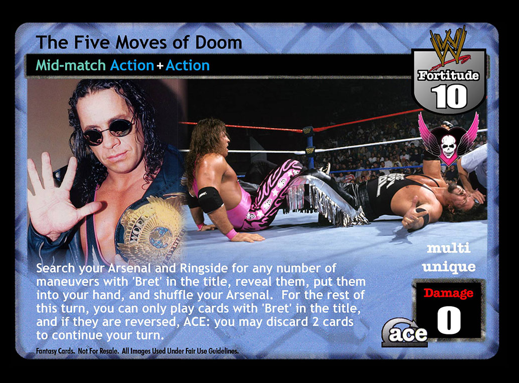 Search your Arsenal and Ringside for Maneuvers with 'Bret' in the title, and put them into your hand. For the remainder of the turn, you can only play cards with 'Bret' in the title, and if they are reversed, ACE: you may discard 2 cards to continue your turn.