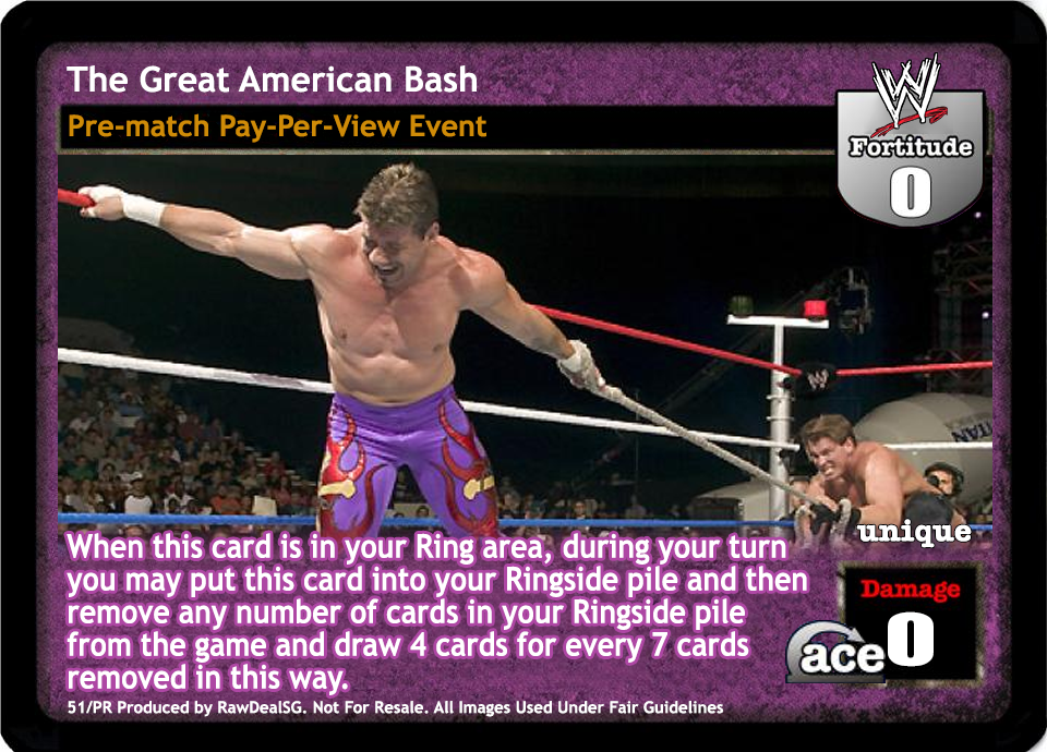 When this card is in your Ring area, during your turn you may put this card into your Ringside pile and then remove any number of cardsin your Ringside pile from the game and draw 4 cards for every 7 cards removed in this way.