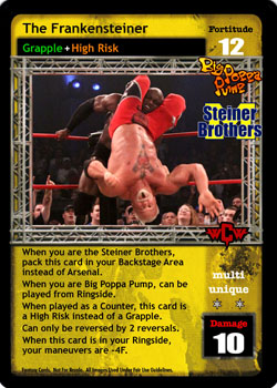 When you are the Steiner Brothers, pack this card in your Backstage Area instead of Arsenal. When you are Big Poppa Pump, can be played from Ringside. When played as a Counter, this card is a High Risk instead of a Grapple. Can only be reversed by 2 reversal cards. When this card is in your Ringside, your maneuvers are -4F.