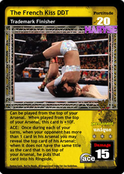 Cannot be blanked and does not take up a slot in your Ring. Any card under this card is considered to also be 'on top of your Arsenal' for your Superstar-specific effects, and when it is a D: 3+ card and you do not have a D: 1+ Pre-match card in your Ring, your Fortitude Rating is +3. ACE: Once during each of your turns, you may put 1 card from your hand or on top of your Arsenal under this card face-up, and then put any other cards under this card into your hand; this effect cannot be reversed.