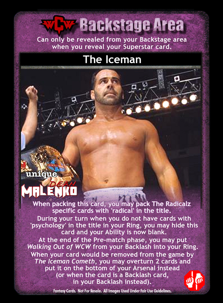 When packing this card, you may pack The Radicalz-specific cards with 'radical' in the title. During your turn when you do not have cards with 'psychology' in the title in your Ring, you may hide this card and your Ability is now blank. At the end of the Pre-match phase, you may put Walking Out of WCW from your Backlash into your Ring. When The Iceman Cometh would remove your card from the game, you may overturn 2 cards and put it on the bottom of your Arsenal instead (or when the card is a Backlash card, in your Ringside instead).