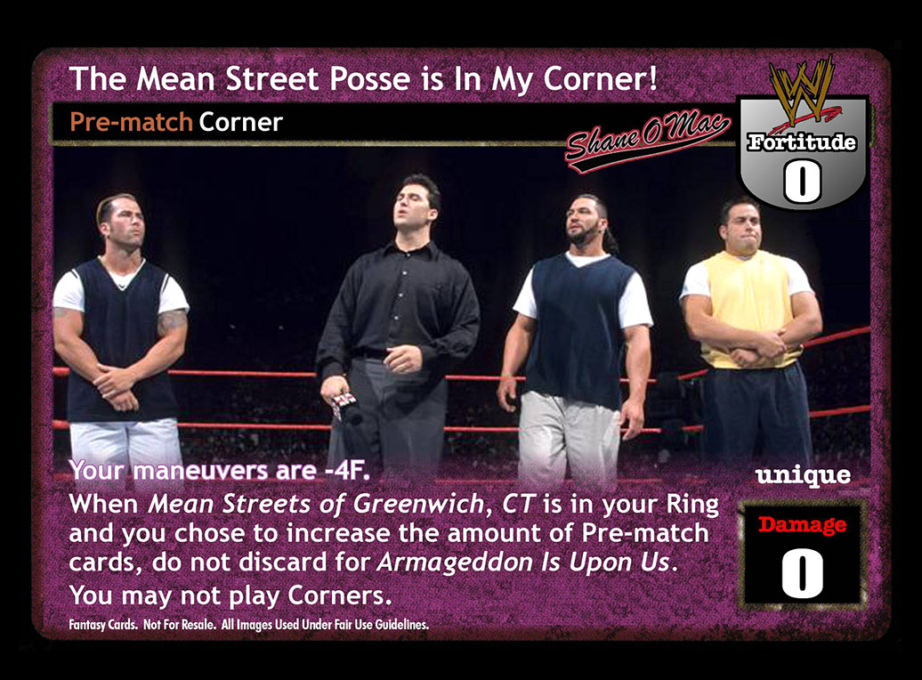 Your maneuvers are -4F. When Mean Streets of Greenwich, CT is in your Ring and you chose to increase the amount of Pre-match cards, do not discard for Armageddon Is Upon Us. You may not play Corner cards.