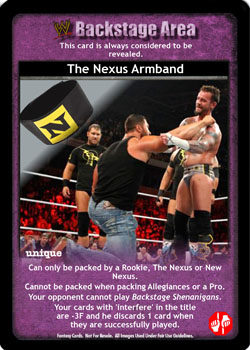 This card is always considered to be revealed. Can only be packed by a Rookie, The Nexus or New Nexus. Cannot be packed when packing Allegiances or a Pro. Your opponent cannot play Backstage Shenanigans. Your cards with 'interfere' in the title are -3F and he discards 1 card when they are successfully played.
