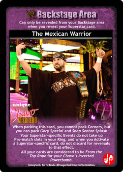 When packing this card, you cannot pack Corners, but you can pack Gory Special and Snap Senton Splash. Your Superstar-specific Events do not take up Pre-match slots in your Ring, and when you Activate a Superstar-specific card, do not discard for reversals to that effect. All your cards are considered to be From the Top Rope for your Chavo's Inverted Powerbomb.
