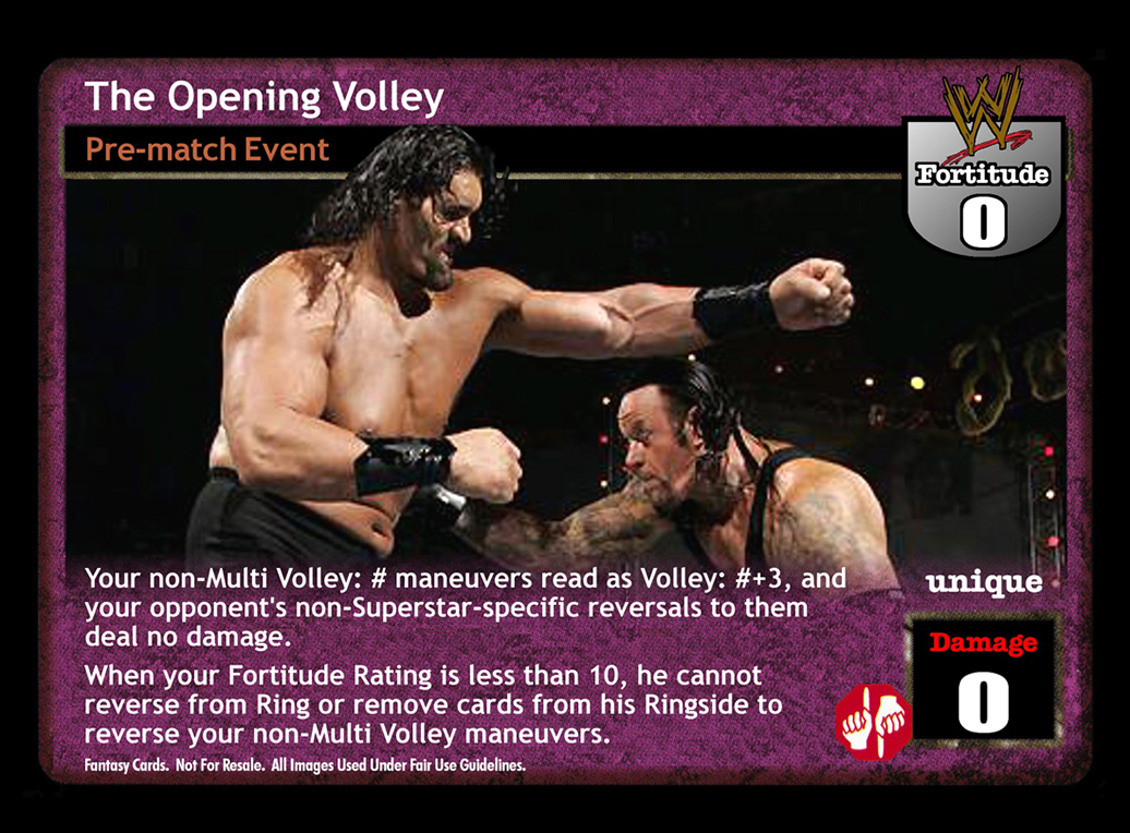 Your non-Multi Volley: # maneuvers read as Volley: #+3, and your opponent's non-Superstar-Specific reversals to them deal no damage. When your Fortitude Rating is less than 10, he cannot reverse from Ring or remove cards from his Ringside to reverse your non-Multi Volley maneuvers.