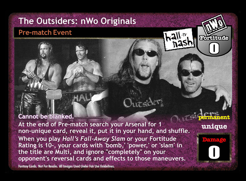 Cannot be blanked. At the end of Pre-match search your Arsenal for 1 non-unique card, reveal it, put it in your hand, and shuffle. When you play Hall's Fall-Away Slam or your Fortitude Rating is 10-, your cards with 'bomb,' 'power,' or 'slam' in the title are Multi, and ignore 'completely' on your opponent's reversal cards and effects to those maneuvers.