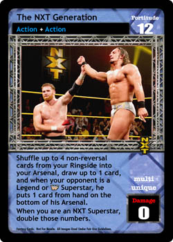 Shuffle up to 4 non-reversal cards from your Ringside into your Arsenal, draw up to 1 card, and when your opponent is a Legend or Classic WWF Superstar, he puts 1 card from hand on the bottom of his Arsenal. When you are an NXT Superstar, double those numbers.