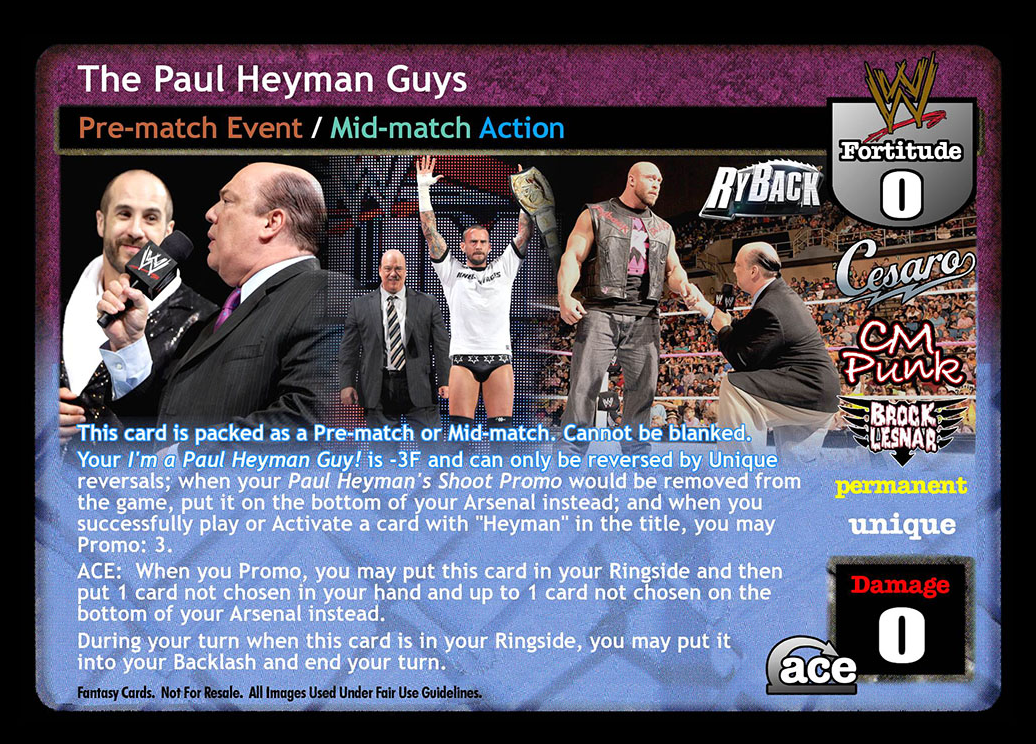 This card is packed as a Pre-match or Mid-match. Cannot be blanked. Your I'm a Paul Heyman Guy! is -3F and can only be reversed by Unique reversals; when your Paul Heyman's Shoot Promo would be removed from the game, put it on the bottom of your Arsenal instead; and when you successfully play or Activate a card with 'Heyman' in the title, you may Promo: 3. ACE: When you Promo, you may put this card in your Ringside and then put 1 card not chosen in your hand and up to 1 card not chosen on the bottom of your Arsenal instead. During your turn when this card is in your Ringside, you may put it into your Backlash and end your turn.