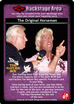 Your Starting Hand Size, Superstar Value, and Pre-match Capacity are +1 for each WCW and non-Faction The Nature Boy-specific non-Faction Pre-match card in your Ring. Once during each of your turns, you may either overturn 2 cards, and you are considered to be Ric Flair for the rest of the turn; or you may overturn 4 cards, and you are considered to be The Four Horsemen for the rest of the turn.