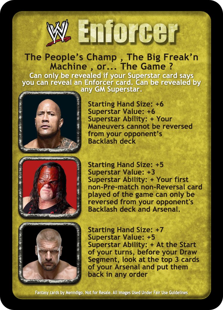 Can only be revealed if your Superstar card says you can reveal an Enforcer card. Can be revealed by any GM Superstar. - Starting Hand Size: +6 Superstar Value: +6 Superstar Ability: +Your maneuvers cannot be reversed from your opponent's Backlash deck. - Starting Hand Size: +5 Superstar Value: +3 Superstar Ability: +Your first non-Pre-match non-Reversal card of the game can only be reversed from your opponent's Backlash deck and Arsenal. - Starting Hand Size: +7 Superstar Value: +5 Superstar Ability: +At the start of your turn, before your Draw Segment, look at the top 3 cards of your Arsenal and put them back in any order.