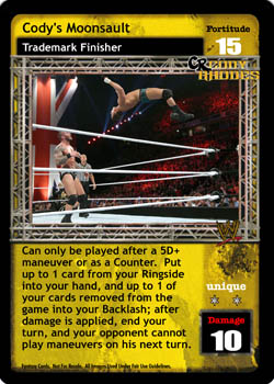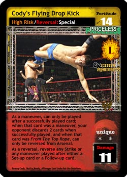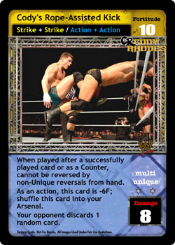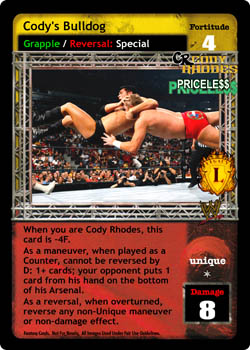When you are Cody Rhodes, this card is -4F. As a maneuver, when played as a Counter, cannot be reversed by D: 1+ cards; your opponent puts 1 card from his hand on the bottom of his Arsenal. As a reversal, when overturned, reverse any non-Unique maneuver or non-damage effect and draw 1 card.