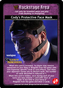 Can only be revealed when you play From Dashing to Disfigured. When this card is revealed, no player can move maneuvers in your Ring or Ringside from the game with non-Superstar-specific cards or effects, and when your opponent causes you to discard cards, the number of cards discarded is reduced to 1. When this card is hidden, once during each of your turns you may remove 1 card with 'face' or 'mask' in the title in your hand or Ringside from the game and draw 2 cards.