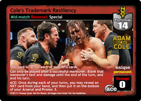 This card is -2F for each of your RFG cards. Can only be played after a successful maneuver. Blank that maneuver's text and damage until the end of the turn, and end his turn. ACE: Once during each of your turns, you may reveal an NXT card from your hand, and then put it on the bottom of your Arsenal and Promo: 3.