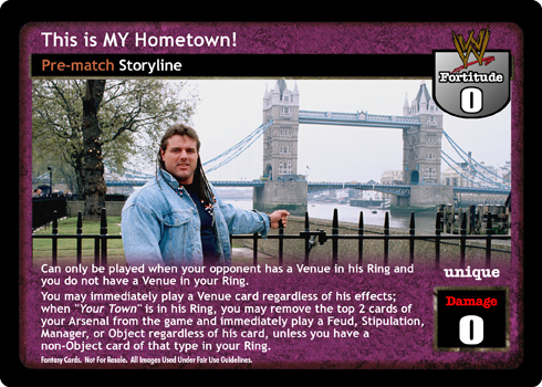 Can only be played when your opponent has a Venue in his Ring and you do not have a Venue in your Ring. You may immediately play a Venue card regardless of his effects; when 'Your Town' is in his Ring, you may remove the top 2 cards of your Arsenal from the game and immediately play a Feud, Stipulation, Manager, or Object regardless of his card; unless you have a non-Object card of that type in your Ring.