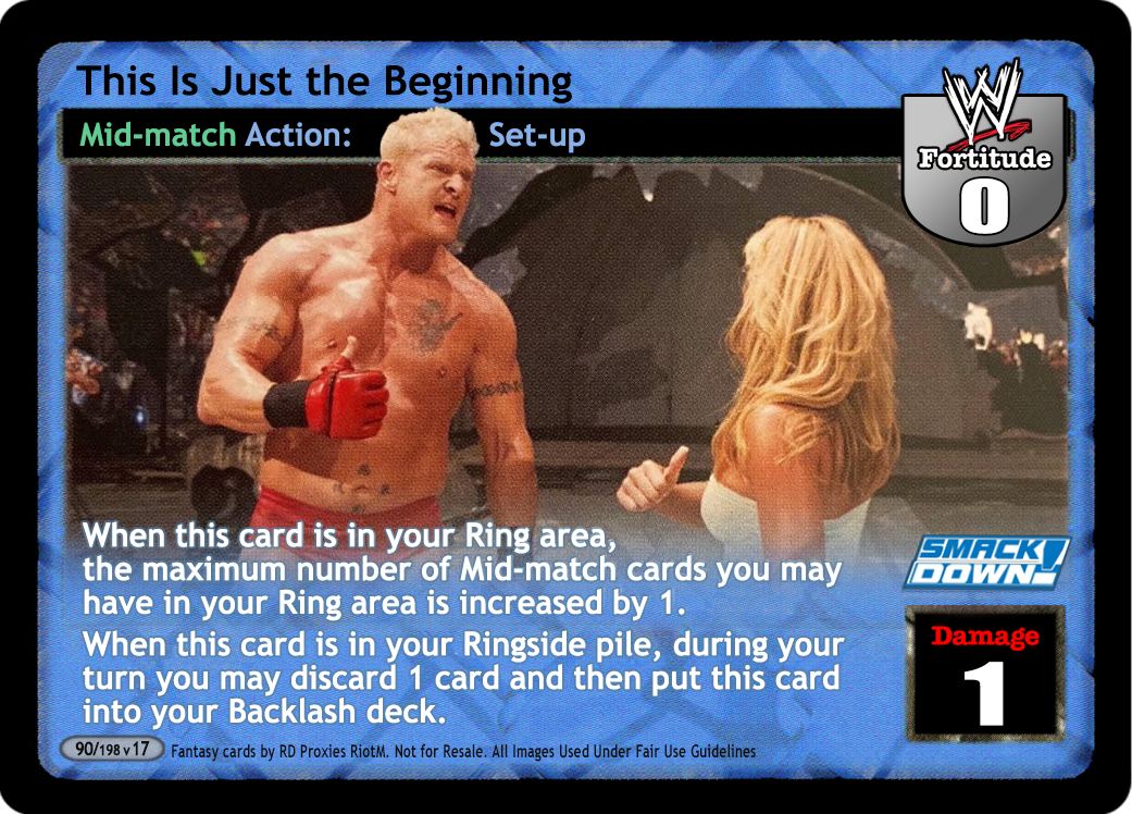 When this card is in your Ring area, the maximum number of Mid-match cards you may have in your Ring area is increased by 1. When this card is in your Ringside pile, during your turn you may discard 1 card and then put this card into your Backlash deck.