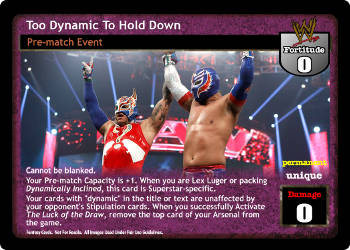 Cannot be blanked. Your Pre-match Capacity is +1. When you are Lex Luger or packing Dynamically Inclined, this card is Superstar-specific. Your cards with 'dynamic' in the title or text are unaffected by your opponent's Stipulation cards. When you successfully Activate The Luck of the Draw, remove the top card of your Arsenal from the game.