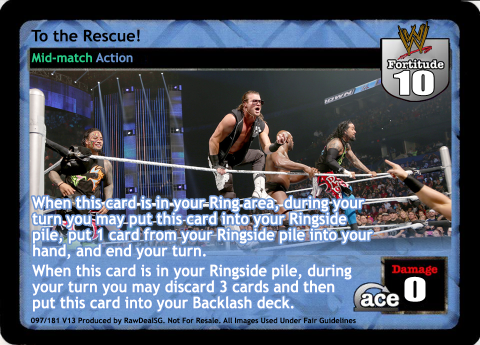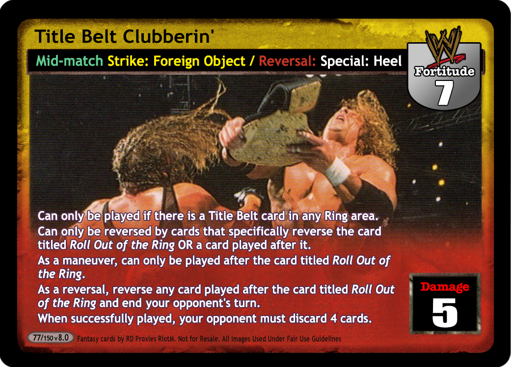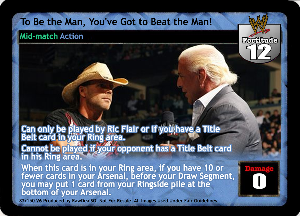 Can only be played by Ric Flair or if you have a Title Belt card in your Ring area. Cannot be played if your opponent has a Title Belt card in his Ring area. When this card is in your Ring area, if you have 10 or fewer cards in your Arsenal, before your Draw Segment, you may put 1 card from your Ringside pile at the bottom of your Arsenal.