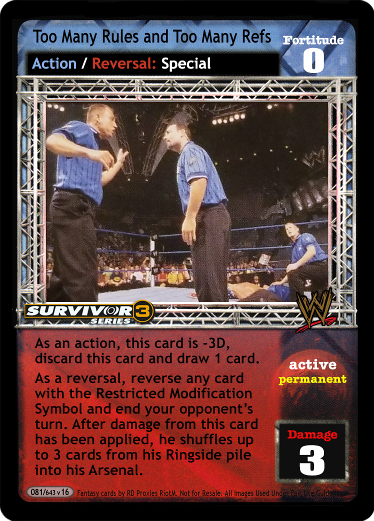 As an action, you may discard this card and draw 1 card. Doing this will cause no damage to your opponent. As a reversal, reverse any card with the Restricted Modification Symbol and end your opponent's turn. After damage from this card has been applied, your opponent shuffles up to 3 cards from his Ringside pile into his Arsenal.