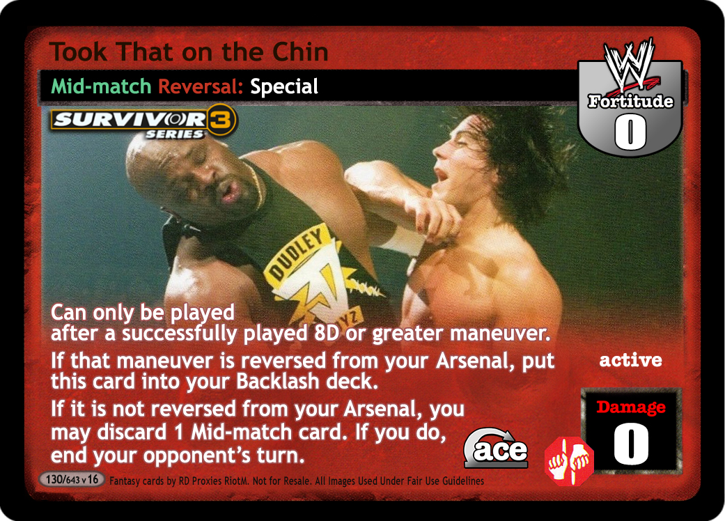 Can only be played after a successfully played 8D or greater maneuver. If that maneuver is reversed from your Arsenal, put this card into your Backlash deck. If it is not reversed from your Arsenal, you may discard 1 Mid-match card. If you do, end your opponent's turn.