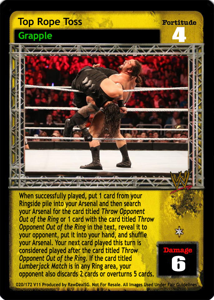 When successfully played, put 1 card from your Ringside pile into your Arsenal and then search your Arsenal for the card titled Throw Opponent Out of the Ring or 1 card with the card titled Throw Opponent Out of the Ring in the text, reveal it to your opponent, put it into your hand, and shuffle your Arsenal. Your next card played this turn is considered played after the card titled Throw Opponent Out of the Ring. If the card titled Lumberjack Match is in any Ring area, your opponent also discards 2 cards or overturns 5 cards.