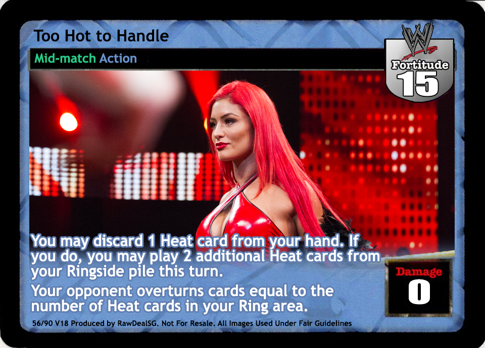 You may discard 1 Heat card from your hand. If you do, you may play 2 additional Heat cards from your Ringside pile this turn. Your opponent overturns cards equal to the number of Heat cards in your Ring area.
