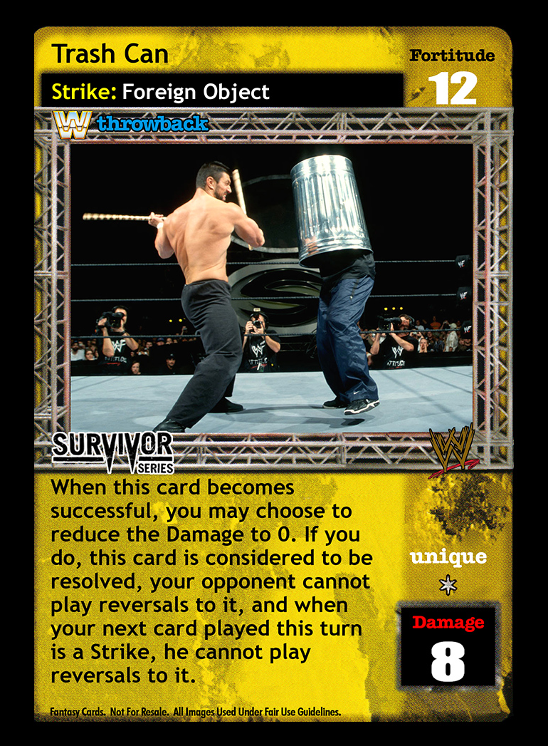 When the card titled Trash Can is in the Ring, once per turn, any player on their turn may discard a card to "use" the Trash Can. For each "use" Trash Can may be reversed as usual. If reversed, put it into owner's Ringside pile. In the event there is more than one Trash Can in the Ring, declare the one you are using; each can be used only once per turn.
