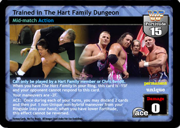 Can only be played by a Hart Family member or Chris Benoit. When you have The Hart Family in your Ring, this card is -15F and your opponent cannot respond to this card. Your maneuvers are -2F. ACE: Once during each of your turns, you may discard 2 cards and then put 1 non-Unique non-hybrid maneuver from your Ringside into your hand; when you have lower Fortitude, this effect cannot be reversed.
