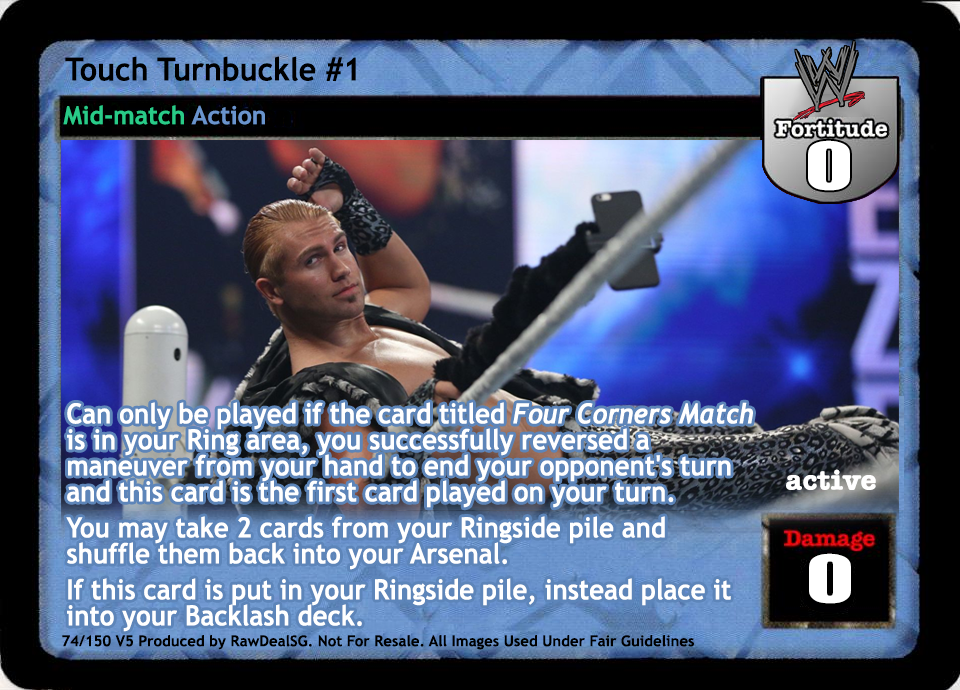 Can only be played if the card titled Four Corners Match is in your Ring area, you successfully reversed a maneuver from your hand to end your opponent's turn and this card is the first card played on your turn. You may take 2 cards from your Ringside pile and shuffle them back into your Arsenal. If this card is put in your Ringside pile, instead place it into your Backlash deck.
