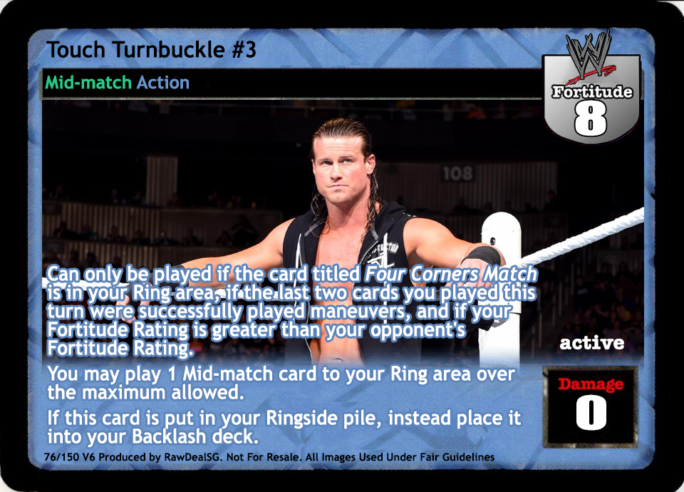 Can only be played if the card titled Four Corners Match is in your Ring area, after a successfully played maneuver, and your Fortitude Rating is greater than your opponent's Fortitude Rating. You may draw 1 card. If this card is put in your Ringside pile, instead place it into your Backlash deck.