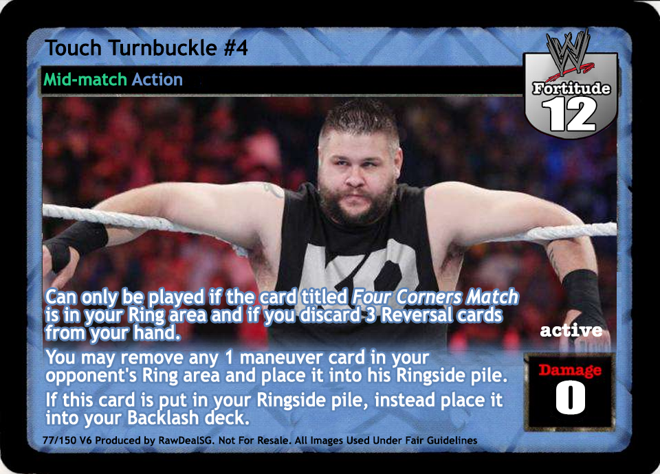 Can only be played if the card titled Four Corners Match is in your Ring area and if you discard 3 Reversal cards from your hand. You may remove any 1 maneuver card in your opponent's Ring area and place it into his Ringside pile. If this card is put in your Ringside pile, instead place it into your Backlash deck.