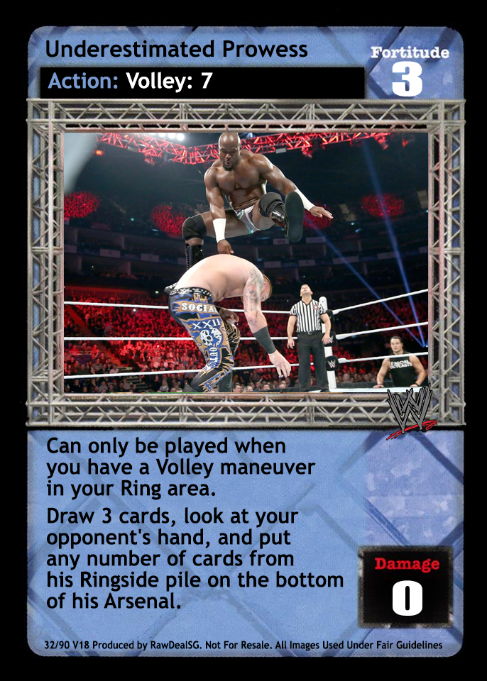 At the end of the Pre-match phase, when your Superstar Value is 2 or less, draw 3 cards. If you are not the player with the lowest Superstar Value, discard 1 card.