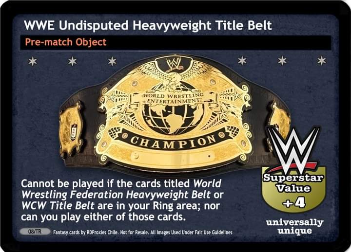 Cannot be played if the cards titled World Wrestling Federation(r) Heavyweight Title Belt or WCW Title Belt are in your Ring area; nor can you play either of those cards. Superstar Value +4