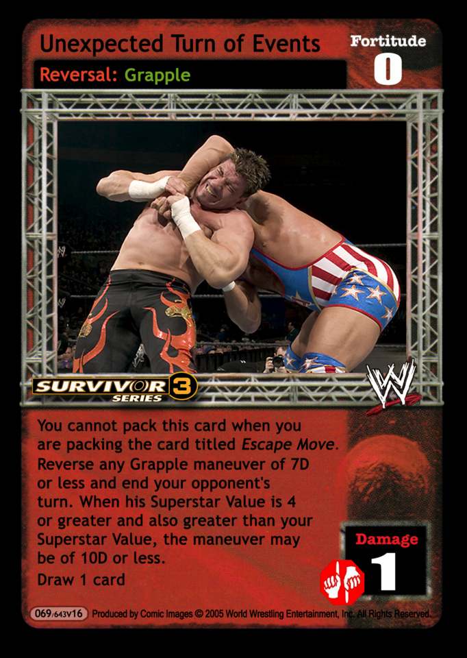 Can only be played after a successfully played non-0F maneuver and if your Fortitude Rating is less than your opponent's Fortitude Rating and if you have fewer cards in your hand than your opponent. The maneuver does its normal damage, regardless of overturned Reversal cards. Your opponent then puts Maneuver cards from his Ring area into his Ringside pile until his Fortitude Rating is equal to or less than that maneuver's F. End your opponent's turn. When played by Raw GM Eric Bischoff, you choose the cards instead of your opponent.