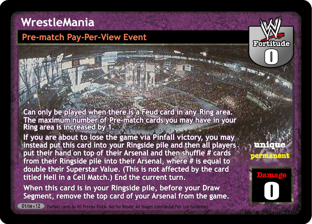 Can only be played when there is a Feud card in any Ring area. The maximum number of Pre-match cards you may have in your Ring area is increased by 1. If you are about to lose the game via Pinfall victory, you may instead put this card into your Ringside pile and then all players put their hand on top of their Arsenal and then shuffle # cards from their Ringside pile into their Arsenal, where # is equal to double their Superstar Value. (This is not affected by the card titled Hell in a Cell Match.) End the current turn. When this card is in your Ringside pile, before your Draw Segment, remove the top card of your Arsenal from the game.