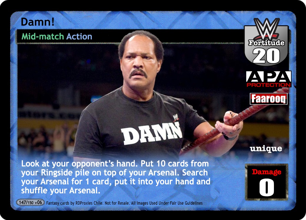 This card does not take up a Pre-match slot in your Ring. When your opponent is not an NXT Superstar, he removes the top 4 cards of his Arsenal from the game. Reversals to your maneuvers with 'chop', 'clothesline', and 'figure four' in the title are -4D. ACE: Once during each of your turns when you have lower Fortitude, you may discard 1 card and then put 1 card that is not an F: 0 maneuver from his Ring in his Ringside.