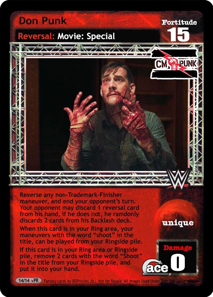 Reverse anu non-trademark-finisher maneuver and end your opponent`s turn. Your opponent may discard 1 reversal card from his hand, if he does not, he randomly discards 2 cards from his backlash deck. When this card is in your ring are, your maneuvers with the word “Shoot” in the title can be played form your ringside pile. If his card is in your ring area or ringside pile, remove 2 cards with the word “Shoot” in the title from your ringside pile and put it into your hand.