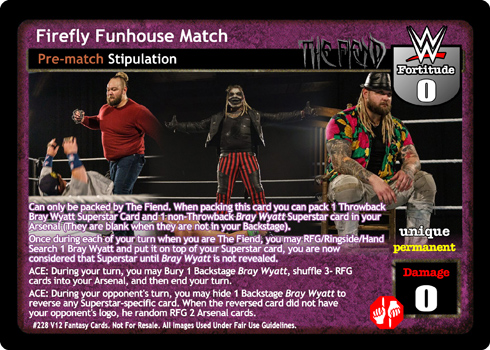 Can only be packed by The Fiend. When packing this card you can pack 1 Throwback Bray Wyatt Superstar card and 1 non-Throwback Bray Wyatt Superstar card in your Arsenal (They are blank when they are not in your Backstage). During your turn when you are The Fiend, you may RFG/Ringside/Hand Search 1 Bray Wyatt and put it on top of your Superstar card, you are now considered that Superstar until Bray Wyatt is not revealed. ACE: Once during each of your turns, you may Bury 1 Backstage Bray Wyatt, shuffle 3- RFG cards into your Arsenal, and then end your turn. ACE: During your opponent's turn, you may hide 1 Backstage Bray Wyatt to reverse any Superstar-specific card. When the reversed card did not have your opponent's logo, he randomly RFG 2 Arsenal cards.
