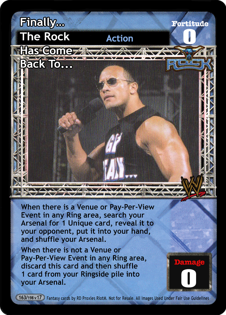 When there is a Venue or Pay-Per-View Event in any Ring area, search your Arsenal for 1 Unique card, reveal it to your opponent, put it into your hand, and shuffle your Arsenal. When there is not a Venue or Pay-Per-View Event in any Ring area, discard this card and then shuffle 1 card from your Ringside pile into your Arsenal.