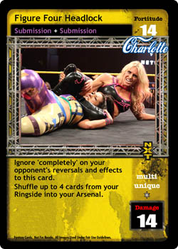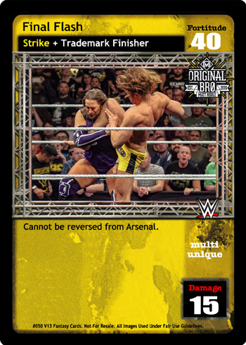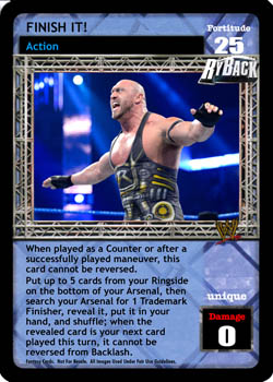 When played as a Counter or after a successfully played maneuver, cannot be reversed. Put up to 5 cards from your Ringside on the bottom of your Arsenal, then search your Arsenal for 1 Trademark Finisher, reveal it, put it in your hand, and shuffle; when the revealed card is your next card played this turn, it can't be reversed from Backlash.
